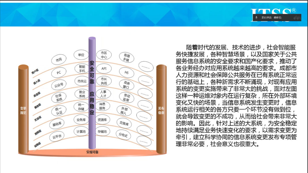 2024年(nián)5月(yuè)30日(rì),中國(guó)電(diàn)子(zǐ)工(gōng)業(yè)标準化(huà)技(jì¶)術(shù)協會(huì)信息技(jì)術(shù)服務分(fēn)會(huì)(以下(xià)稱ITSS分(fēn)會(huì))特邀成都(dōu)市(shì)人(rén)力資源社會(huì)↔保障信息中心公共服務部部長(cháng)嶽彩雲(高(gāo)級工(gōng)程師(shī)、高(gāo)級項目經↔理(lǐ))開(kāi)展了(le)題為(wèi)甲方視(shì)角的(de)應用(yòng)系統運行(xíng)維護之需求變更發布管理(lǐφ)良好(hǎo)實踐分(fēn)享會(huì),本次活動旨在進一(yī)步提升ITSS标準傳遞、共享和(hé)轉換,促進信息技(jì)術(shù)服務産業(yè)高(gāo)質量發展。